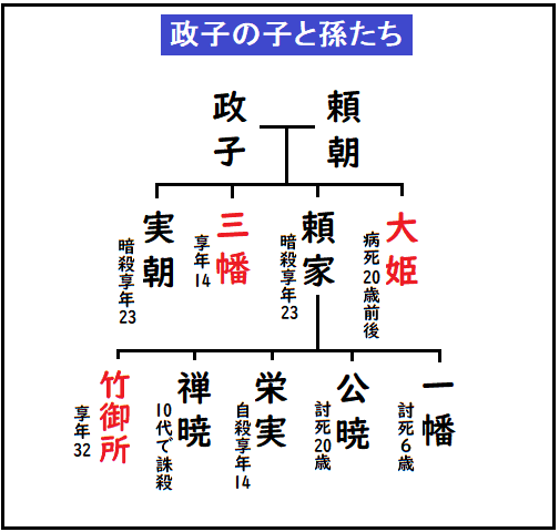 長女・大姫、長男・頼家、二女・三藩(久姫)、そして次男・実朝です。すべて20代前半までに亡くなっています。政子が母として辛い思いの連続だったことが想像されます。(孫も一人を除いて若死にです)